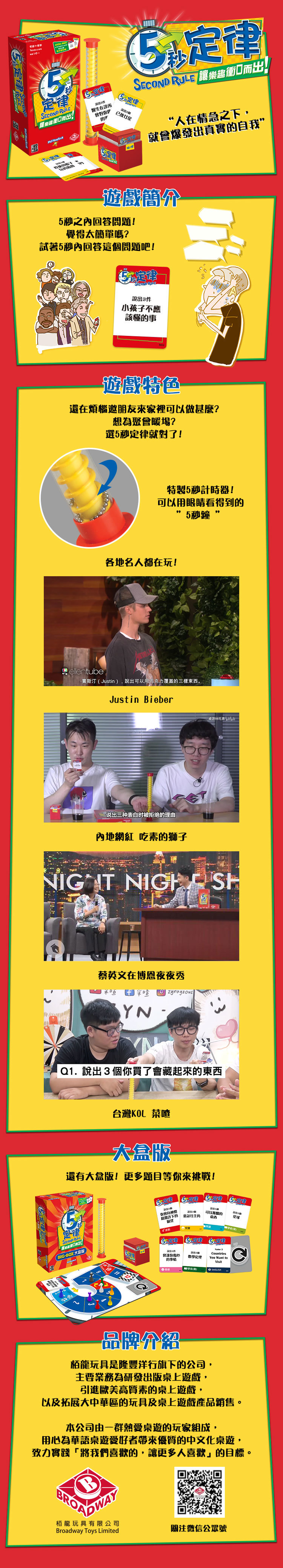 栢龍皇牌產品《5秒定律》 將會推出大盒版,除了題目有了全新的分類系統,讓玩家可以因應難度、場合選擇題庫,亦會改以在版圖上前進作為計分方法,而且當玩家行到特定格數,遊戲立即會改變玩家答題順序。更多的零件,讓遊戲更多變體更多樂趣!