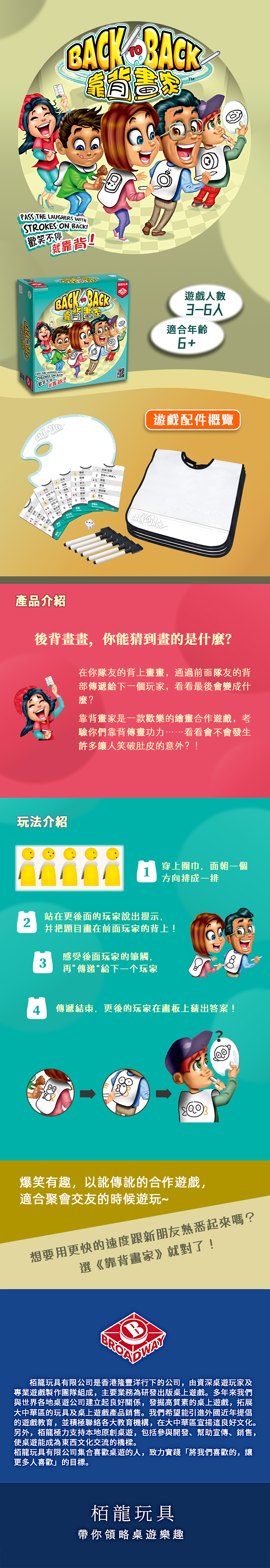 在你隊友的背上畫畫,讓他們把你的畫作逐一傳遞給下一位玩家,看看最後會變成什麼啦!靠背畫家是一款3-6人合作的繪畫遊戲,考驗你們靠背傳畫的功力……抑或會鬧出大笑話?